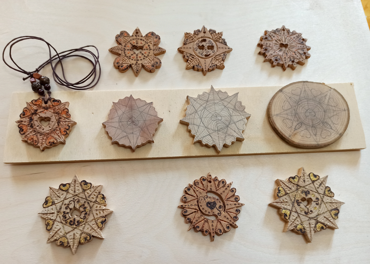 È a questo punto che la nostra Carla si specializza nelle sue “Creazioni d’arte” interamente fatte a mano. Si occupa personalmente di tutte le fasi della realizzazione dei manufatti esposti nel suo laboratorio aperto nel 2009. Dal disegno preliminare, al taglio del legno, alla pittura, alla vendita e quando serve alla spedizione. Tutto è nelle sue mani.