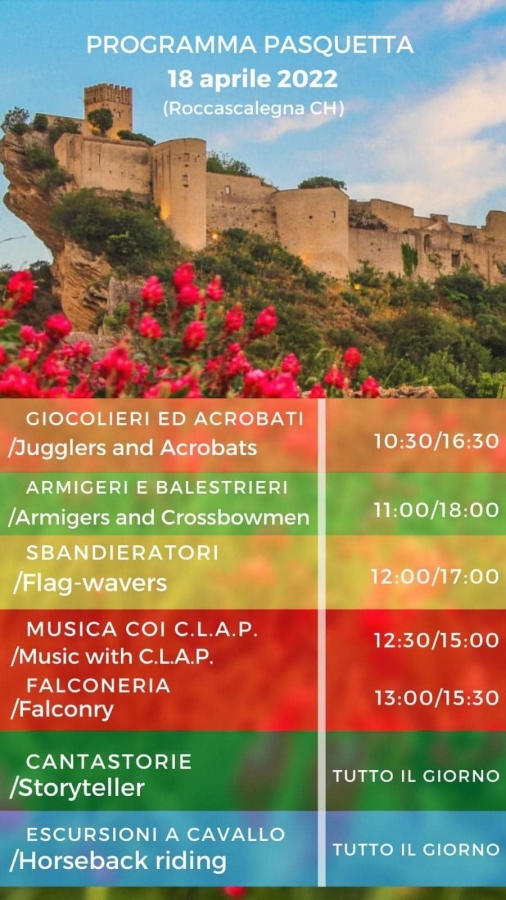 L’intera giornata sarà animata da una serie di eventi e spettacoli a tema medievale con la possibilità di visitare il Castello di Roccascalegna, una delle più famose fortificazioni della regione Abruzzo, dalle ore 09:00 alle ore 19:00.