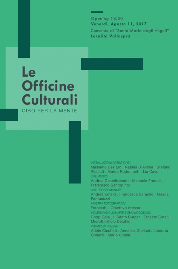 "Il Convento di Santa Maria degli Angeli di Atessa, in località Vallaspra, si trasformerà in una vera e propria fabbrica di cultura - come scrivono gli organizzatori - in cui prendono parte tutte le forme d'arte: poesia, musica, installazioni d'arte contemporanea, live painting, performance di teatro/danza e gusto".