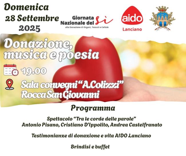 L'AIDO gruppo intercomunale di Lanciano ODV in occasione della Giornata Nazionale del Sì alla donazione di organi, tessuti e cellule organizza "Donazione, musica e poesia" con il patrocinio del Comune di Rocca San Giovanni, domenica 28 settembre alle ore 19 nella Sala convegni "A. Colizzi".