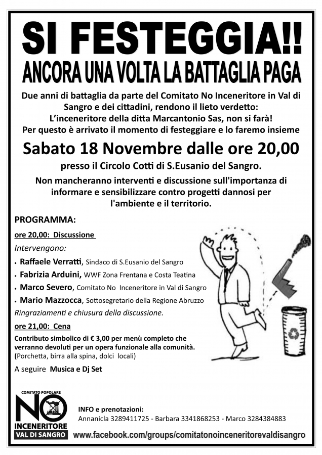 L'intero ricavato della cena insieme al rimanente fondo cassa del Comitato NO Inceneritore in Val di Sangro sarà successivamente devoluto per un opera utile alla comunità che porti con se il ricordo della battaglia vinta.