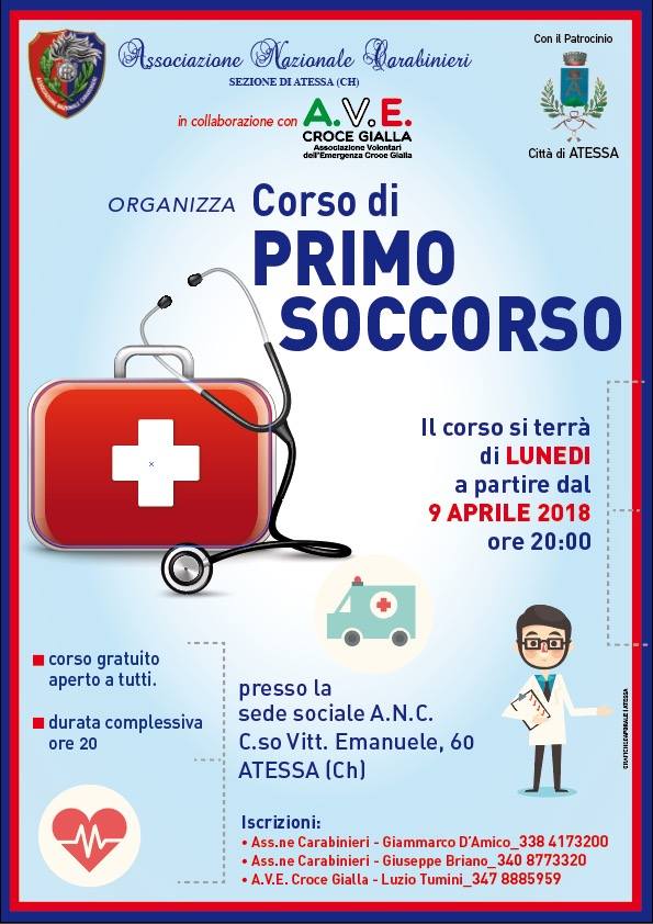ATESSA – Al via la nuova iniziativa promossa dall’Associazione Nazionale Carabinieri di Atessa, dal 9 aprile parte infatti il corso di Primo Soccorso in collaborazione con A.V.E. – Croce Gialla e con il Patrocinio del Comune di Atessa.  Una delle nuove attività che inaugura quest’anno e rivolta a tutti con iscrizione gratuita.