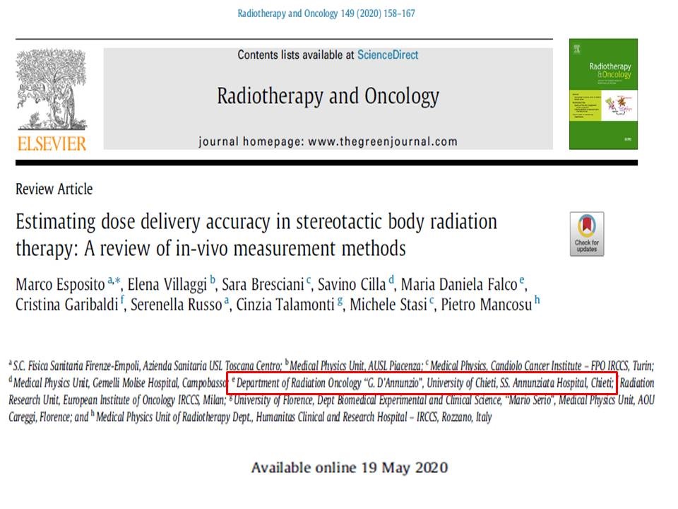 Insieme ai Centri di Radioterapia di Firenze, Empoli, Piacenza, IRCCS di Candiolo-Torino, Campobasso, Istituto Europeo di Oncologia di Milano e Humanitas Rozzano di Milano, Chieti ha infatti condotto uno studio sull'accuratezza della distribuzione della dose Radioterapica in una tecnica di trattamento di estrema precisione balistica quale la Radioterapia Stereotassica. Tecnica oggi di grande potenzialità per le notevoli possibilità di exeresi completa di piccole lesioni tumorali soprattutto nella malattia oncologica oligometastatica, ovvero con un massimo di 1-5 lesioni metastatiche e con malattia tumorale primaria controllata, dove, unitamente alle terapie sistemiche (chemioterapia, terapie biologiche, immunoterapia) si possono avere importanti miglioramenti nella sopravvivenza di questi pazienti.