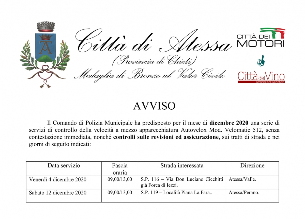 Il comune di Atessa ha pubblicato il calendario dei controlli della velocità che la Polizia municipale ha prediposto nel mese di Dicembre.