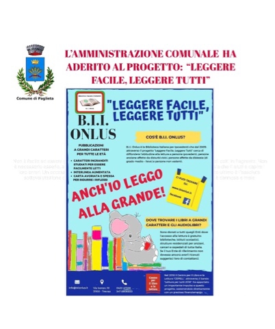 La Giunta comunale di Paglieta, riunita in videoconferenza, ha approvato la delibera con la quale si dà il via libera all'adesione al progetto “Leggere facile, leggere tutti”, proposto dalla Biblioteca italiana per ipovedenti onlus di Treviso.