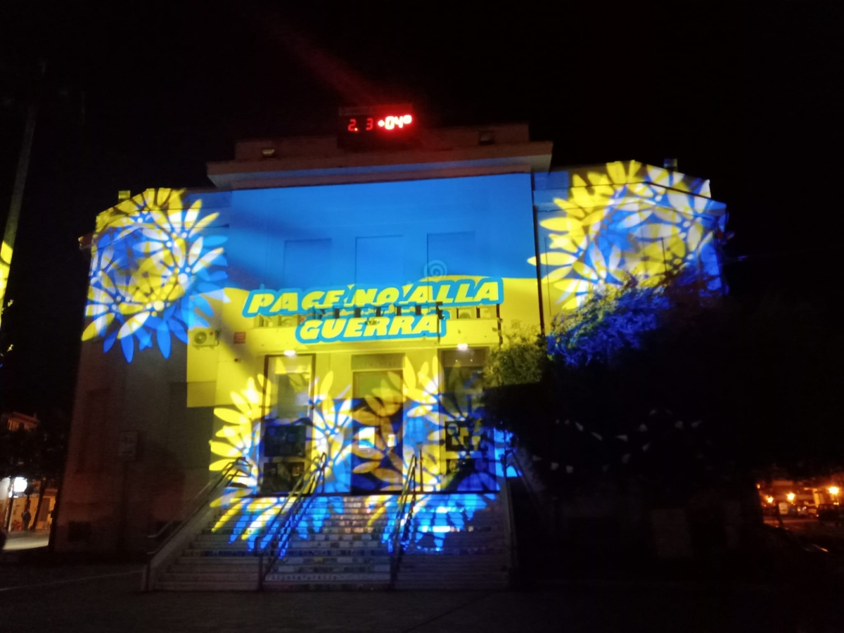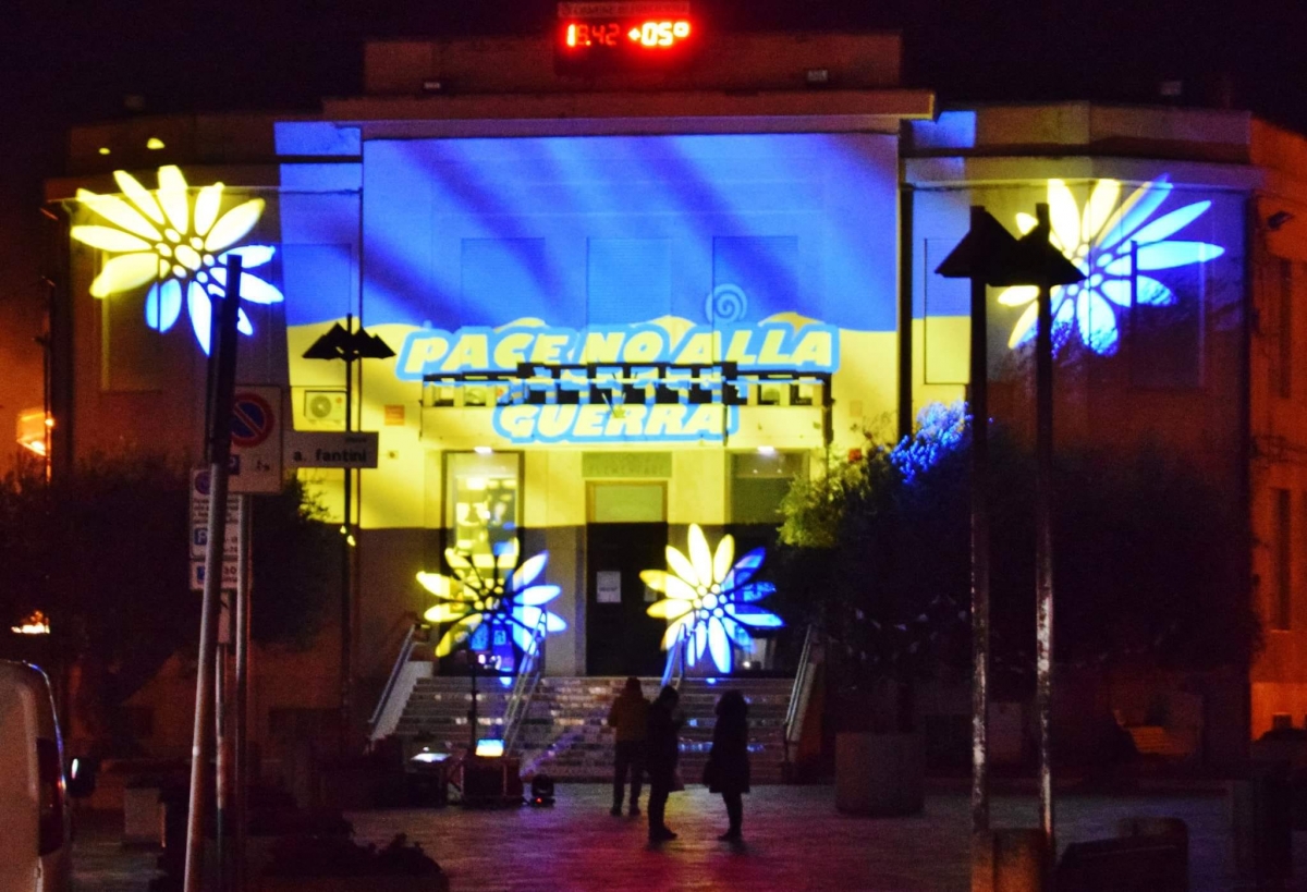 Una volta concluso la seduta, sono state accese luci di colore giallo e blu, come il vessillo dello stato ucraino, sulla facciata della scuola Elementare in piazza Fantini.