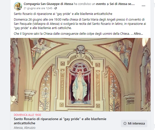 Nei giorni scorsi è apparso in un gruppo social atessano un post, pubblicato dalla pagina “Compagnia San Giuseppe di Atessa”, che annuncia la celebrazione di un Santo Rosario di riparazione ai gay pride e alle blasfemie anticattolica.