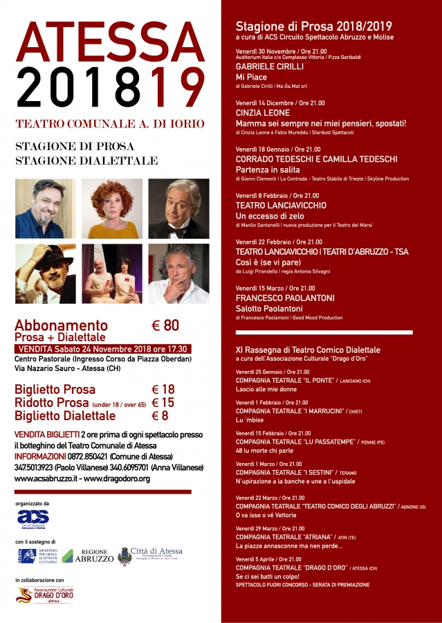 Sabato 24 novembre la vendita degli abbonamenti per l’intero cartellone di 13 spettacoli tra prosa e teatro dialettale alle ore 17.30 al centro Pastorale in Via Nazario Sauro ad Atessa. I Biglietti saranno in vendita anche al botteghino del teatro un'ora prima di ogni spettacolo.