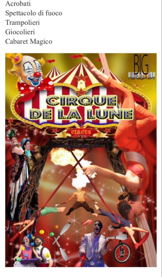 14 - Evento Cirque de la lune (Parcheggio Viale delle Rimembranze). Uno spettacolo unico nel suo genere dell’arte circense: acrobazie, giocoleria, magia, clownerie e spettacoli di fuoco.