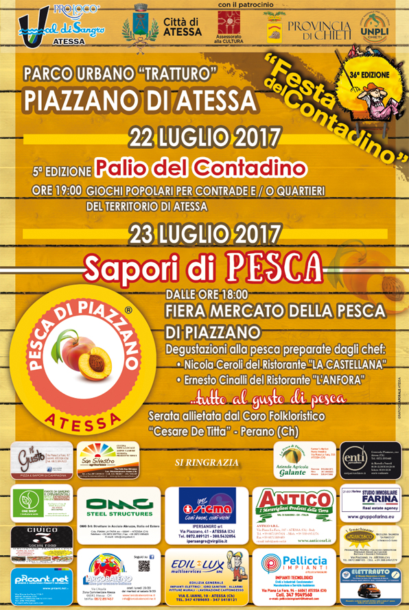 ATESSA - L’Associazione di Promozione Sociale Pro Loco Val di Sangro, in collaborazione con il Comune di Atessa, organizza sabato 22 presso il parco urbano “Tratturo” a Piazzano di Atessa la V Edizione del Palio del Contadino con giochi popolari, tra contrade e quartieri del territorio atessano. Domenica 23 la II Edizione della fiera mercato della pesca di Piazzano “Sapori di Pesca”.