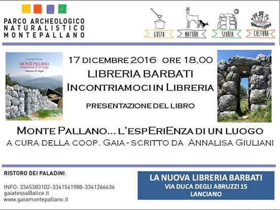 Sabato 17 Dicembre alle ore 18:00, presso la libreria Barbati ci sarà la presentazione del libro "Monte Pallano... L'Esperienza Di Un Luogo", scritto da Annalisa Giuliani, a cura della Cooperativa Gaia, che gestisce il Centro di Educazione Ambientale "Monte Pallano".