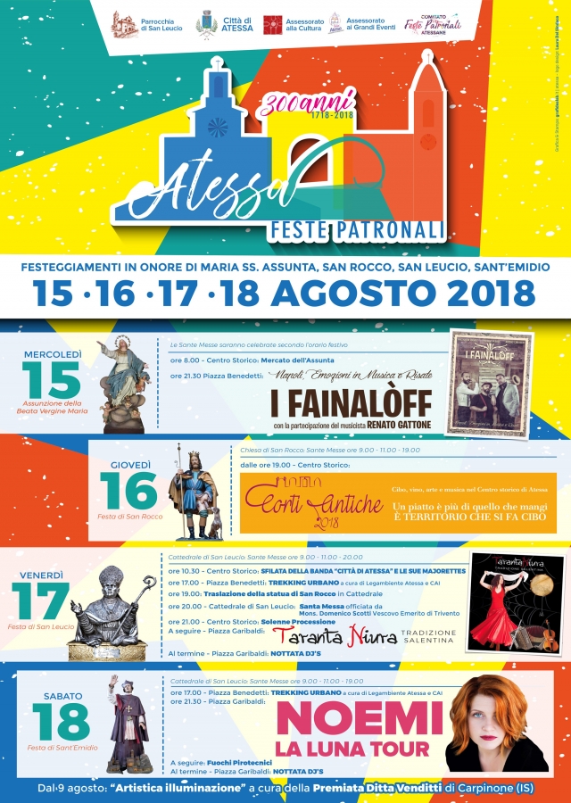 ATESSA – La città è pronta per i quattro giorni più importanti nell’estate atessana, quest’anno per una data particolarmente significativa, quella che segna i 300 anni delle Feste Patronali, una storia antica che racconta anche di una comunità sempre legata alle sue tradizioni.